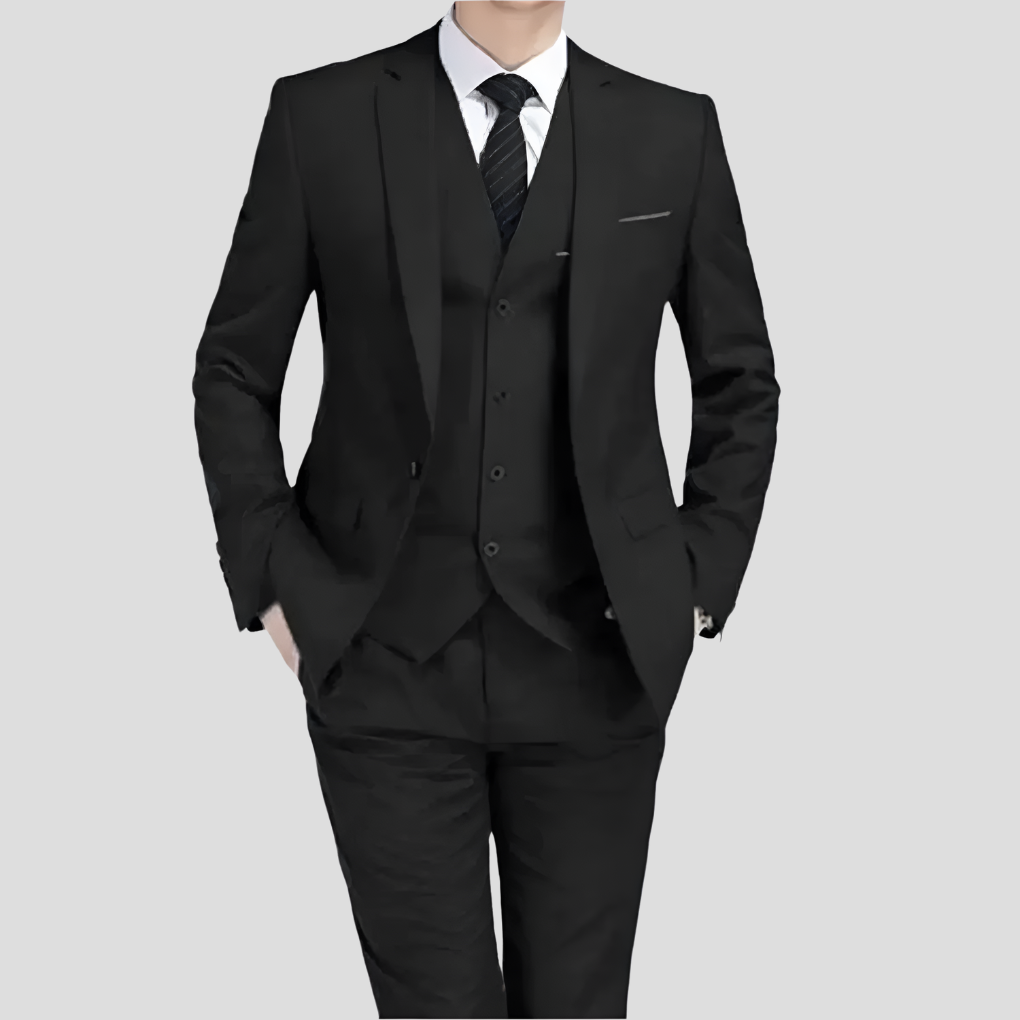 Stap vol zelfvertrouwen de directiekamer binnen of straal elegantie uit tijdens een avondje uit met dit zwarte driedelige pak. Deze verfijnde ensemble bestaat uit een enkelrijig getailleerd jasje, een bijpassend vest en een pantalon zonder bandplooien, gemaakt van rekbaar, kreukvrij materiaal voor een verzorgde look en langdurig comfort. Perfect voor bruiloften, presentaties of formele evenementen, met een gestroomlijnd silhouet dat geschikt is voor elke gelegenheid.