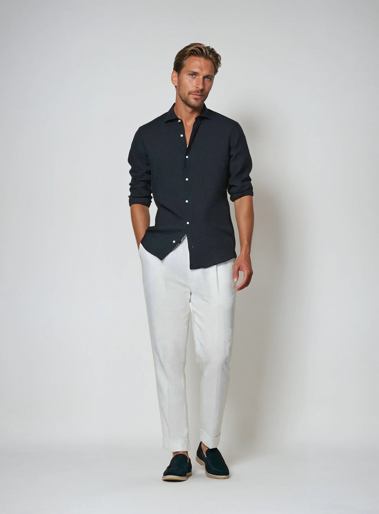 En tidløs klassiker i en moderne nuance. Denne marineblå linnedskjorte tilbyder den perfekte kombination af åndbar komfort og ubesværet stil – ideel til enhver sommer- eller semi-formel lejlighed.